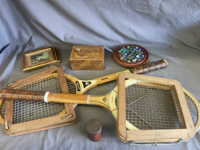 Puzzle box, solitaire game, vintage tennis rackets and other vintage items