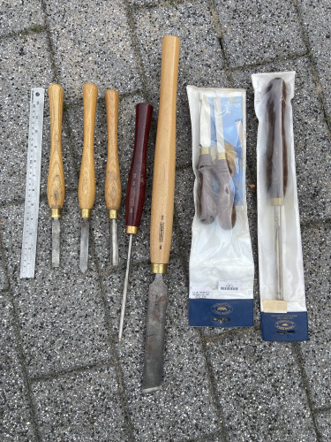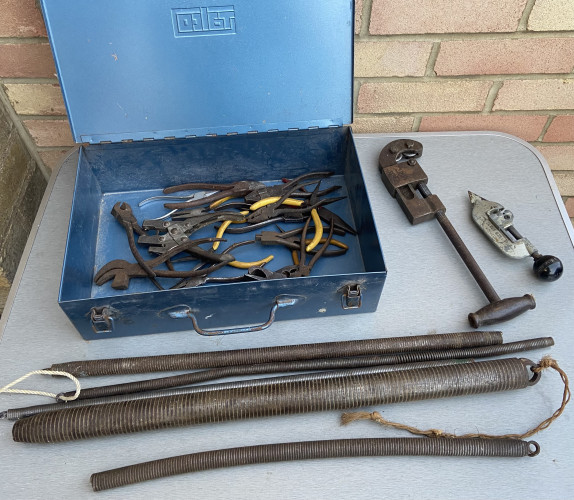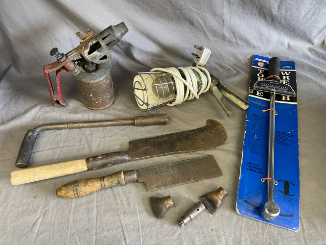 Vintage leather tool bag, horse bridle, wall sign and wedge tool