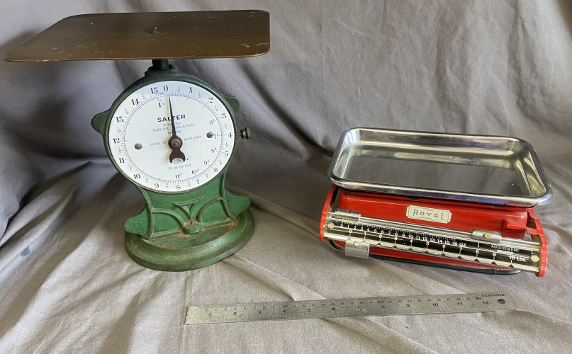Scales, fishing bits, metal card holder and viewer in original box