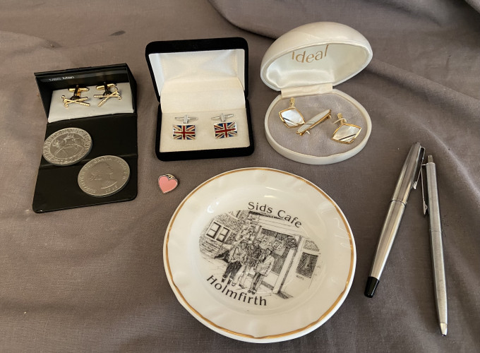 Cufflinks, commemorative coins, plate amd pens