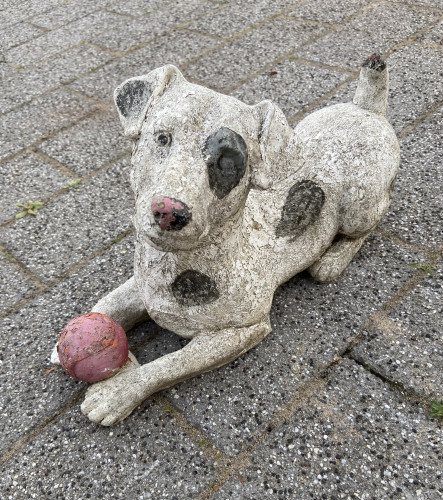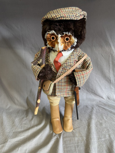 3 Teapots and two dog figures, owl teapot as found