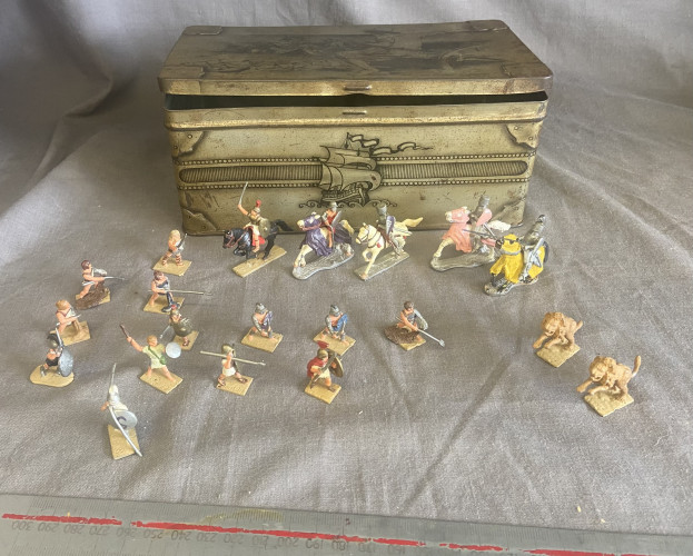 Beautiful figure, 4 metal boxes and an accordion