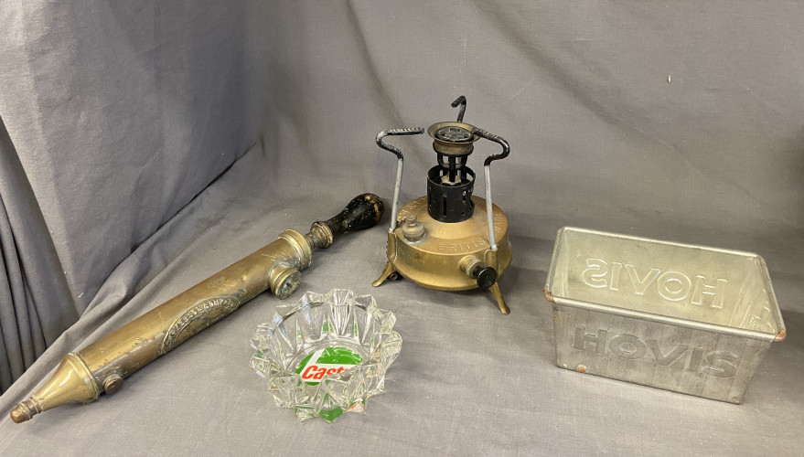 Hovis bread tin, brass garden sprayer, brass stove and ashtray