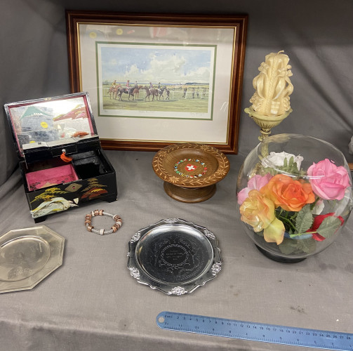 Clown with clock, 32cms small crack on glass and other mixed items